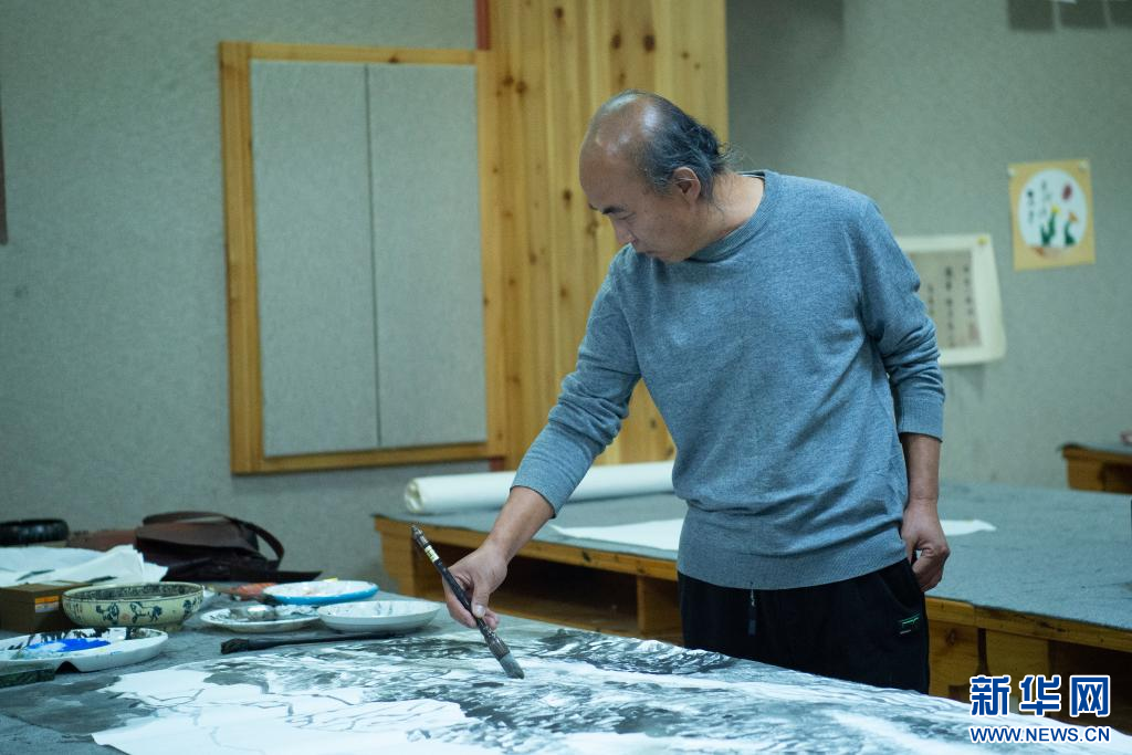 10月16日,畫家張懷偉在創(chuàng)作。新華網(wǎng) 旦增努布 攝