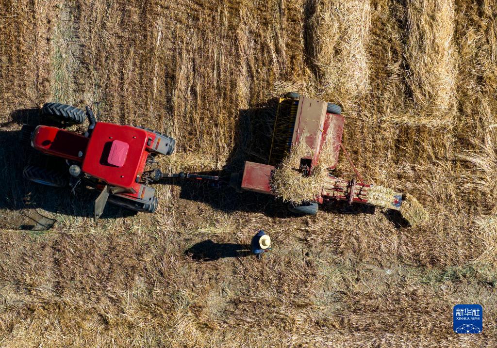 10月24日,村民駕駛農(nóng)機在拉薩市林周縣強嘎鄉(xiāng)曲嘎強村將收割過的牧草打包(無人機照片)。新華社記者 姜帆 攝