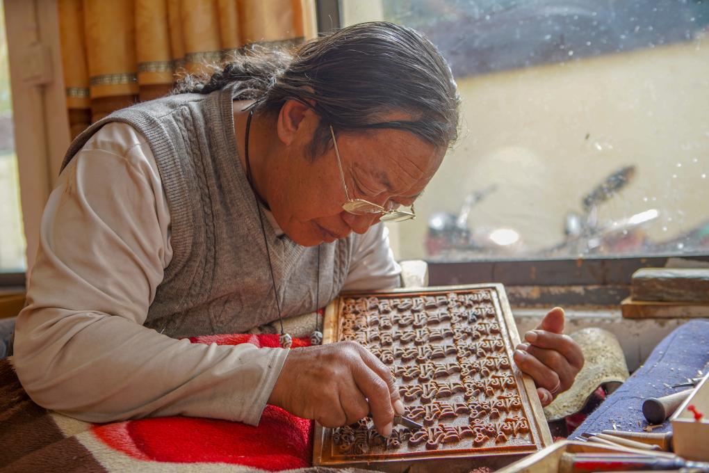 一手緊握刻刀,一手托住木板,刀起刀落間,木屑剝落,一件件樣式精美、色澤瑩潤(rùn)的雕刻成品躍然眼前。在西藏昌都市江達(dá)縣波羅鄉(xiāng)外沖村,“波羅古澤刻版制作技藝”國家級(jí)傳承人澤培正在認(rèn)真指導(dǎo)學(xué)徒制作木刻。