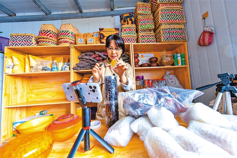 圖為日喀則市吉隆縣吉隆鎮(zhèn)吉甫村村民朗薩通過電商平臺(tái)銷售當(dāng)?shù)靥禺a(chǎn)。記者 格桑吉美 攝