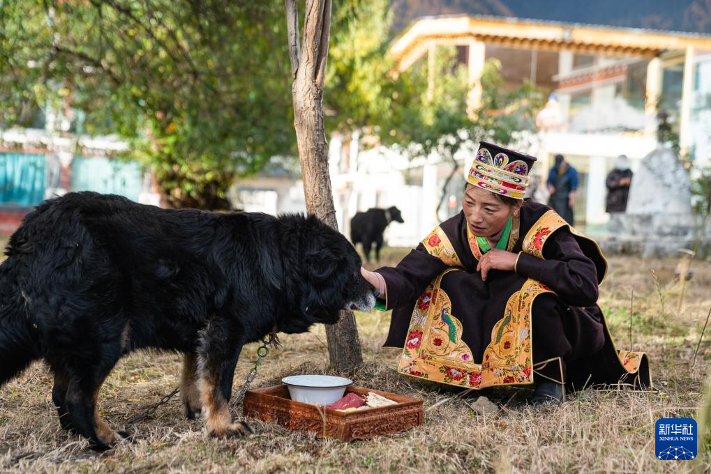 工布新年的大年初一,拉巴卓瑪按照習(xí)俗“請(qǐng)狗赴宴”,為家里的狗端來(lái)了新鮮牛肉、糌粑和牛奶(11月14日攝)。新華社記者 丁增尼達(dá) 攝