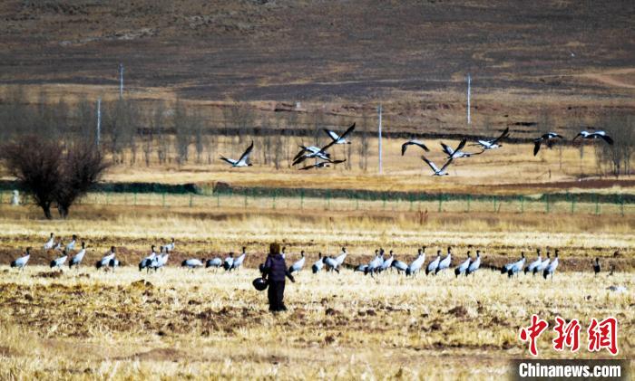 圖為拉薩林周縣境內(nèi)的村民給黑頸鶴投食。扎頓 攝