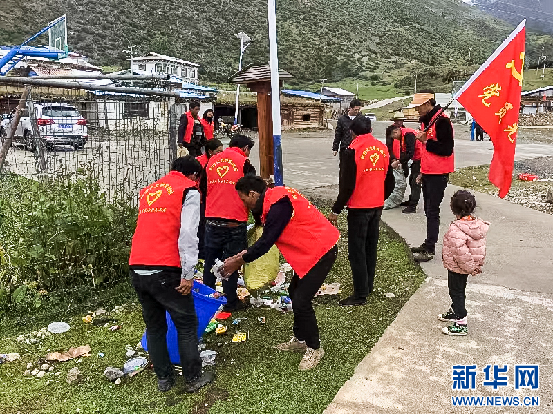 西藏昌都八宿縣然烏鎮(zhèn)來古村組織“冰川上的紅色家園”志愿服務(wù)隊開展環(huán)境整治活動(8月5日攝)。新華社發(fā)