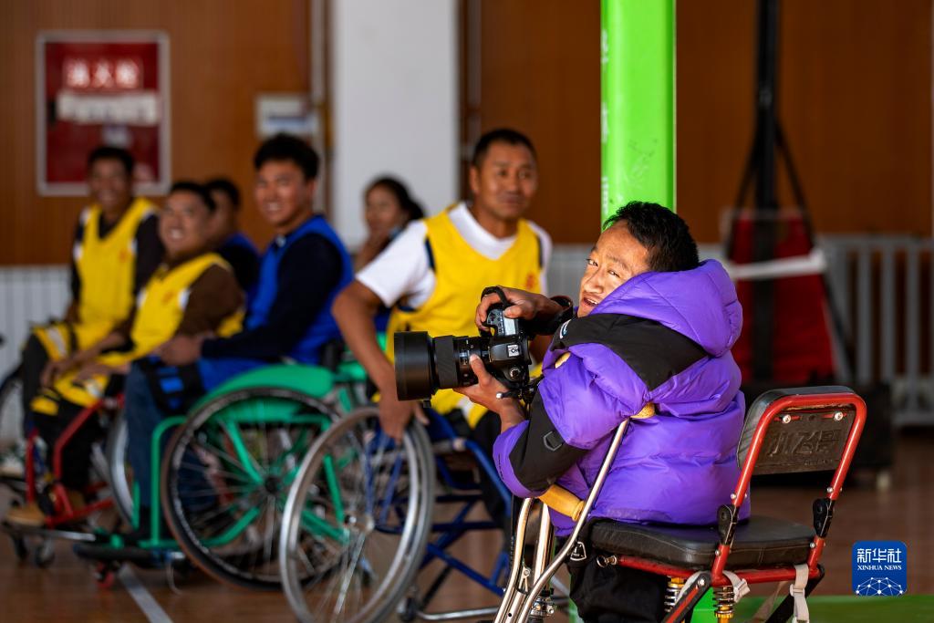 拉巴頓珠(右一)在拍攝輪椅籃球訓(xùn)練(11月26日攝)。新華社記者 姜帆 攝