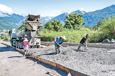 10月13日,工人們?cè)谀摽h修筑鄉(xiāng)村公路。新華社記者 孫 非攝