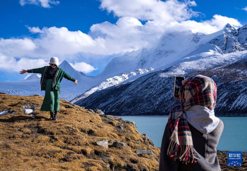 游客在那曲市比如縣羊秀鄉(xiāng)薩普雪山腳下拍照留念(10月28日攝)。新華社記者 孫非 攝