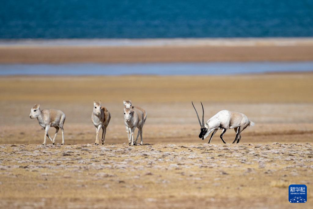 在羌塘國(guó)家級(jí)自然保護(hù)區(qū),一只贏得交配權(quán)的雄性藏羚羊守護(hù)著自己的“后宮”(12月16日攝)。新華社記者 姜帆 攝