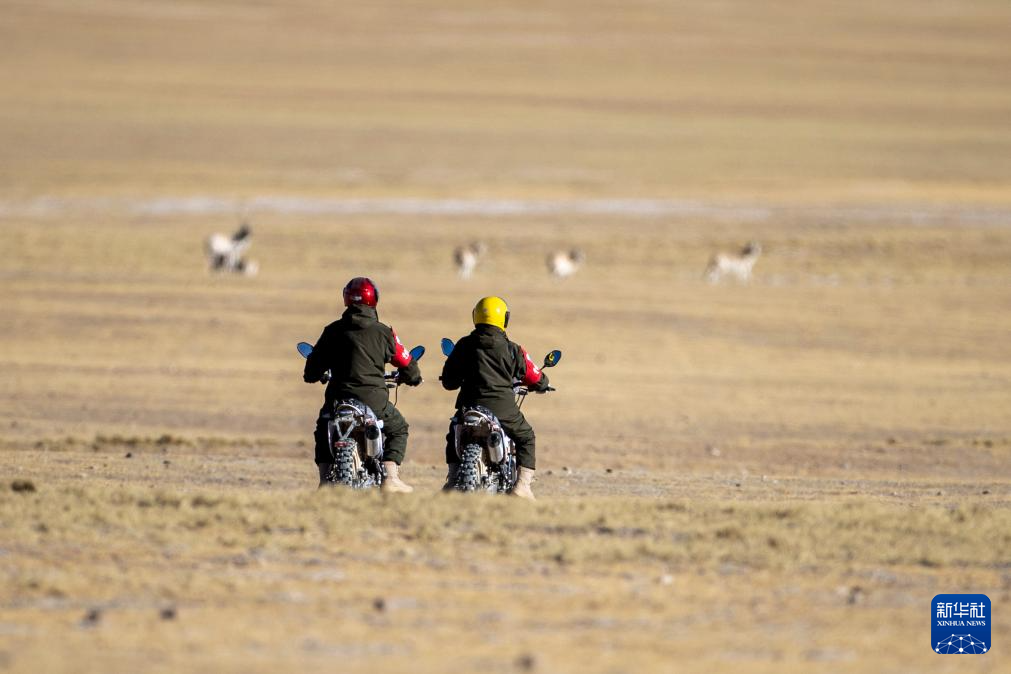 在羌塘國(guó)家級(jí)自然保護(hù)區(qū),野生動(dòng)物管護(hù)隊(duì)員騎著摩托車(chē)觀察藏羚羊(12月17日攝)。新華社記者 姜帆 攝