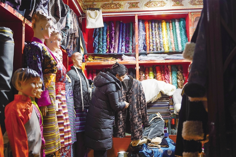 “最近越來越冷了,所以我今天來給女兒買一件厚點(diǎn)的藏裝,剛好她生日也快到了?!弊哌M(jìn)位于北京東路的222藏裝店,琳瑯滿目、顏色絢麗的冬款藏裝讓人眼前一亮,市民尼瑪拉姆正在給女兒挑選藏裝。一旁,店員則在給客人測量三圍、取藏裝、介紹款式,忙得不可開交。