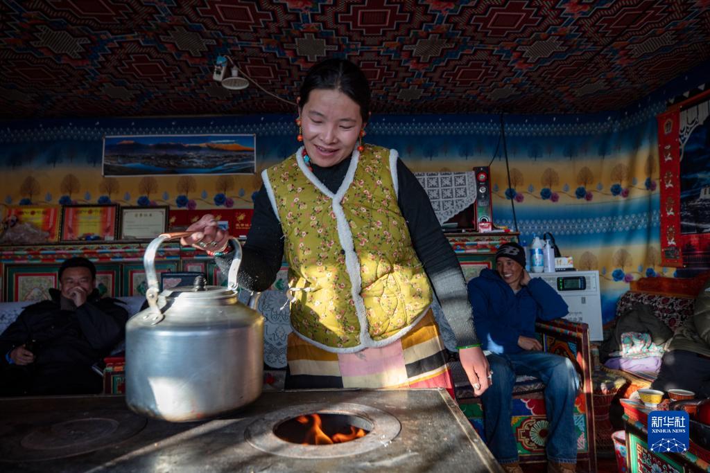 尼瑪縣俄久鄉(xiāng)馬遷村牧民嘎宗在家中的牛糞爐上燒水(12月18日攝)。新華社記者 姜帆 攝