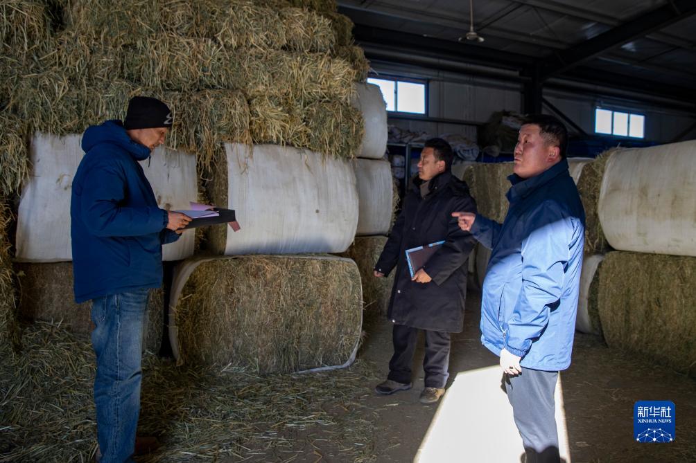 當(dāng)?shù)馗刹吭诙砭绵l(xiāng)農(nóng)牧業(yè)防抗災(zāi)物資儲備庫里盤點(diǎn)物資庫存。這里草料、爐子、棉服、煤炭、除雪工具等一應(yīng)俱全(12月18日攝)。新華社記者 姜帆 攝