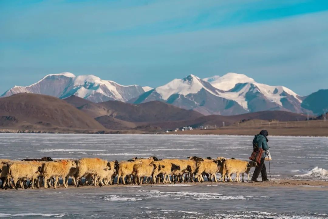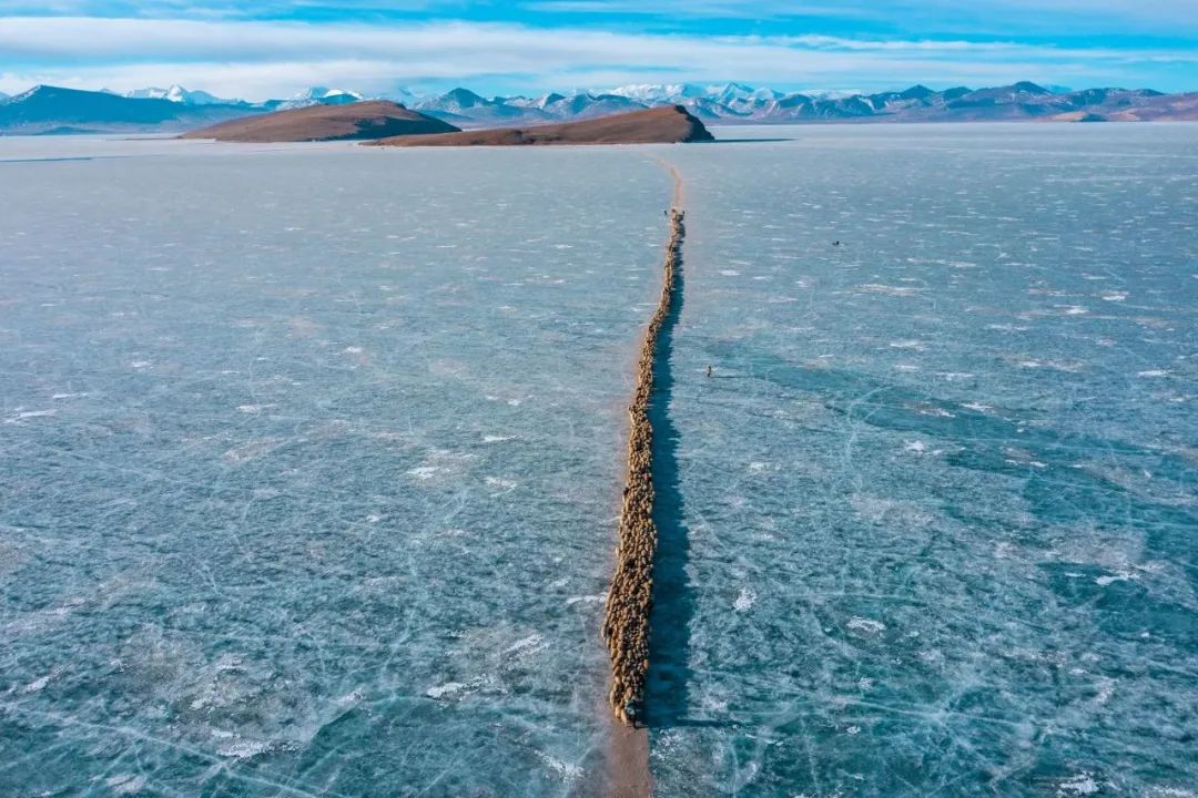 它是世界上海拔最高的村落之一,當(dāng)?shù)卮迕穸家苑拍翞樯?。寒冬來臨,岸上的牧場草料已經(jīng)不夠羊群過冬,推瓦村的村民們把羊群集結(jié)在一起,在冰湖上撒牛糞爐灰,畫出一道冰面上的“羊腸小道”把羊群趕上普姆雍錯湖心島上吃草過冬,雖然只有幾公里的距離,但這個傳承千年的畫面卻給人以史詩般的震撼與感動。