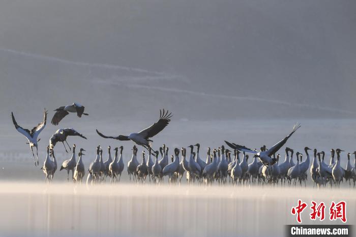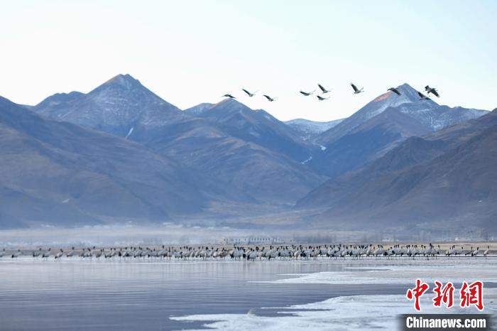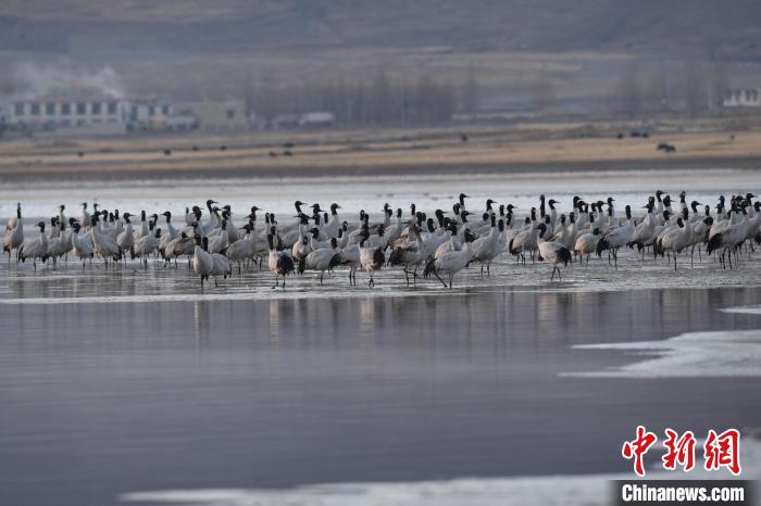 圖為拉薩市林周縣虎頭山水庫(kù)越冬的黑頸鶴。貢嘎來(lái)松 攝