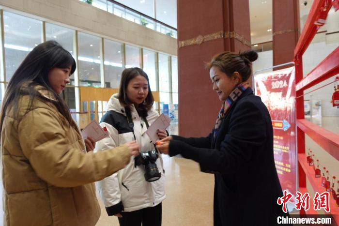 當日上午,西藏博物館中央大廳聚集了許多參加現(xiàn)場活動的游客。游客以隨機抽福袋、領(lǐng)獎品的形式參與活動。參與者紛紛表示在新年的第一天開展這樣的活動很有意義。針對元旦期間來館參觀的游客,西藏博物館還制作有館藏文物元素的主題紀念賀卡供游客留念。