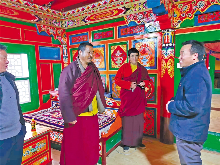 2023年11月17日,自治區(qū)人大代表段世昌(右)在昌都市江達縣汪布頂鄉(xiāng)根沙寺了解寺廟“三個意識”宣傳教育開展情況。