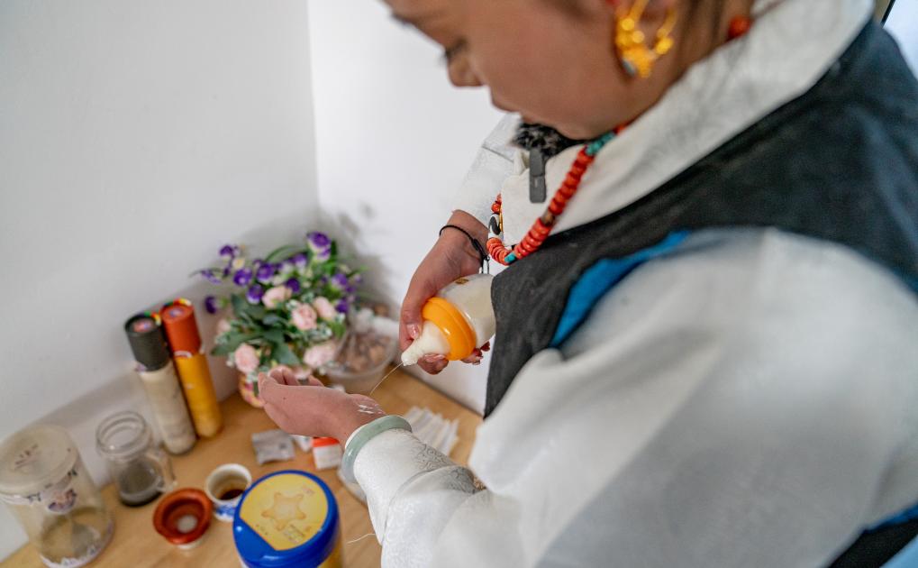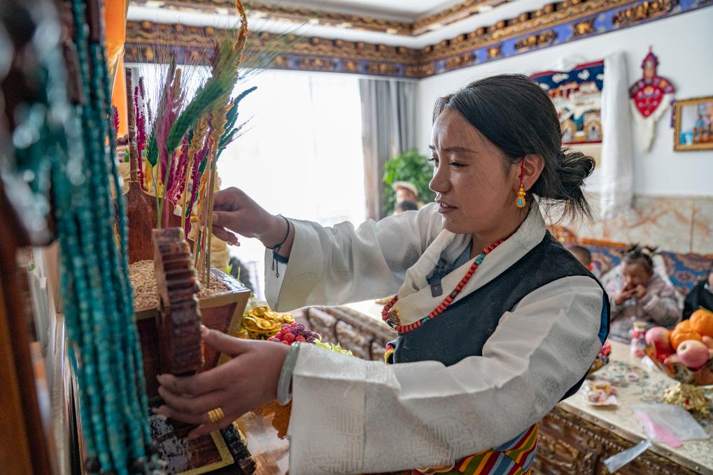 1月8日,愛心媽媽旦增卓瑪在擺放切瑪(五谷斗)。新華社照片,拉薩,2024年1月9日 新華社發(fā)(丁增尼達(dá)攝)