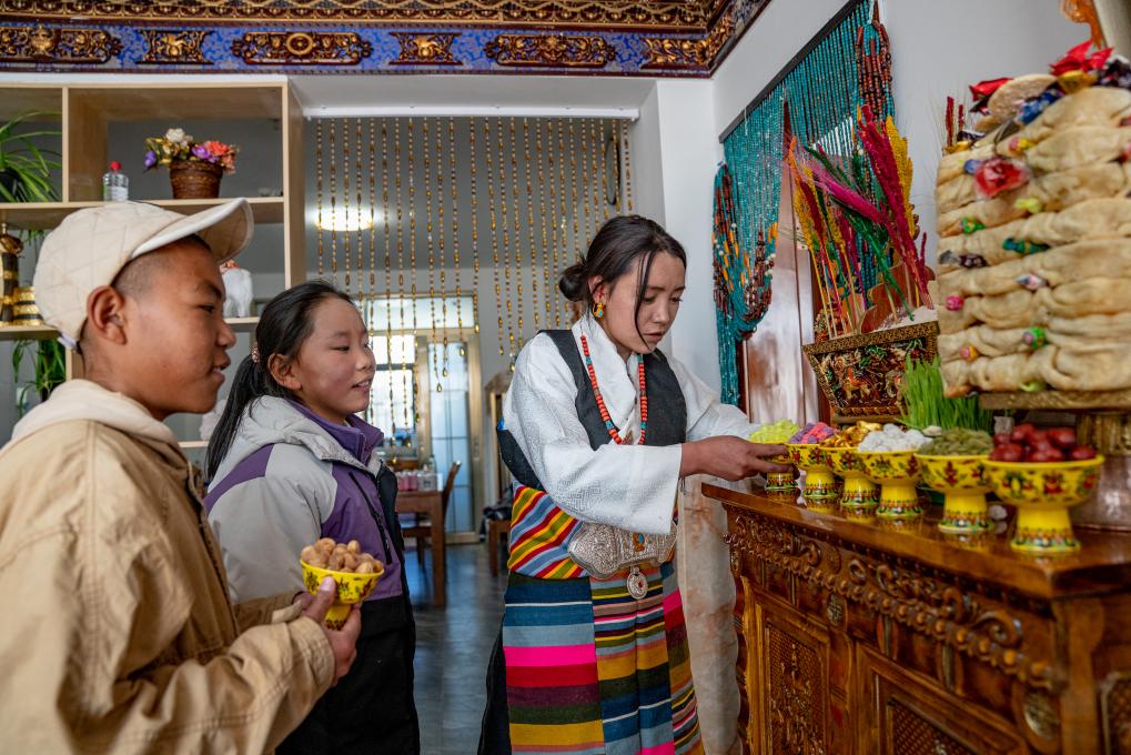 1月8日,愛心媽媽旦增卓瑪和孩子們擺放新年供品。新華社照片,拉薩,2024年1月9日 新華社發(fā)(丁增尼達(dá)攝)
