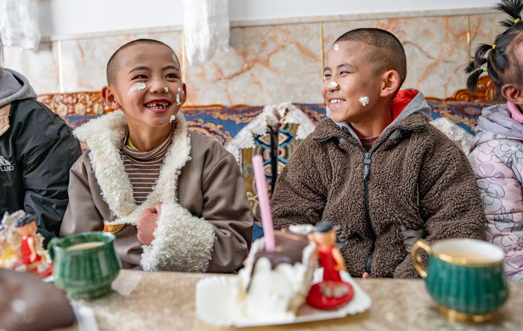 1月8日,“幸福家庭”的孩子們在吃蛋糕。新華社照片,拉薩,2024年1月9日 新華社發(fā)(丁增尼達(dá)攝)