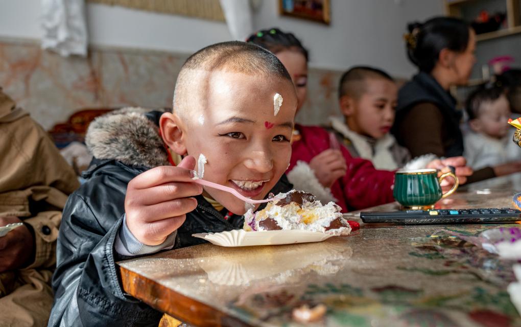 按慣例,今天是福利院孩子們吃新年蛋糕的日子。一首《新年好》唱罷,孩子們開心地吹滅蠟燭,吃起了蛋糕。今年也是巴桑在這個(gè)“家”里度過的第18個(gè)藏歷農(nóng)家新年。