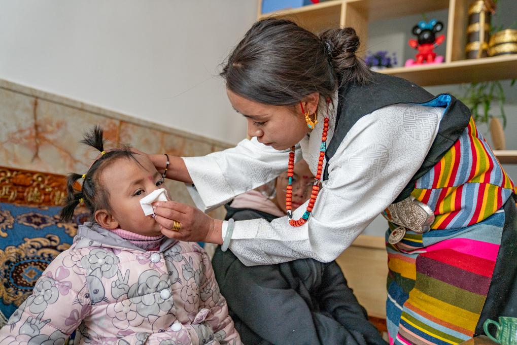 1月8日,愛心媽媽旦增卓瑪在照顧孩子。新華社照片,拉薩,2024年1月9日新華社發(fā)(丁增尼達(dá)攝)