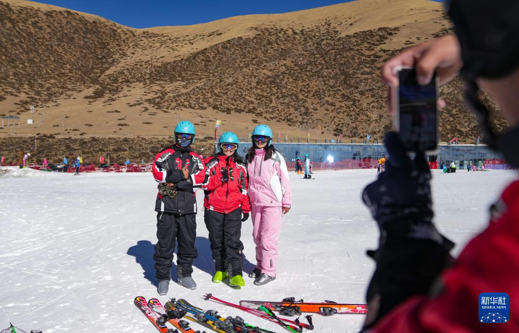 1月13日,滑雪愛(ài)好者在墨多滑雪場(chǎng)合影留念。新華社記者 晉美多吉 攝