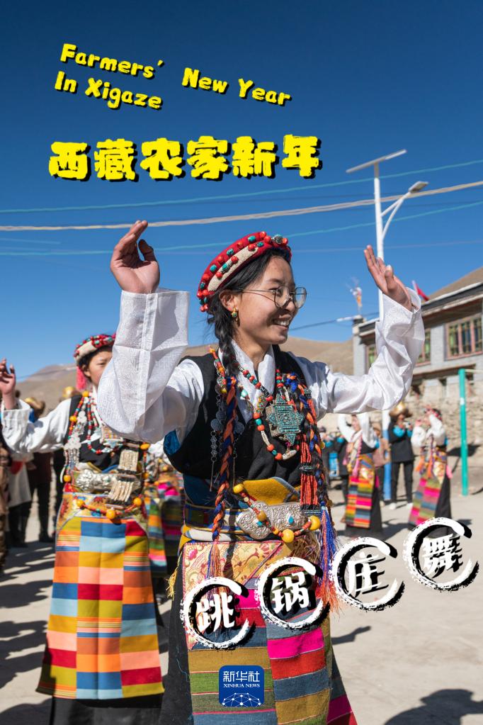 日喀則市白朗縣東喜鄉(xiāng)思古龍村男女老少齊出動,跳起歡快的鍋莊舞辭舊迎新(1月13日攝)。