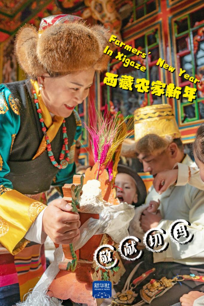 農(nóng)家新年大年初一,敬獻(xiàn)切瑪(又稱五谷豐登斗)有祈愿來年風(fēng)調(diào)雨順,五谷豐登的寓意(1月12日攝)。