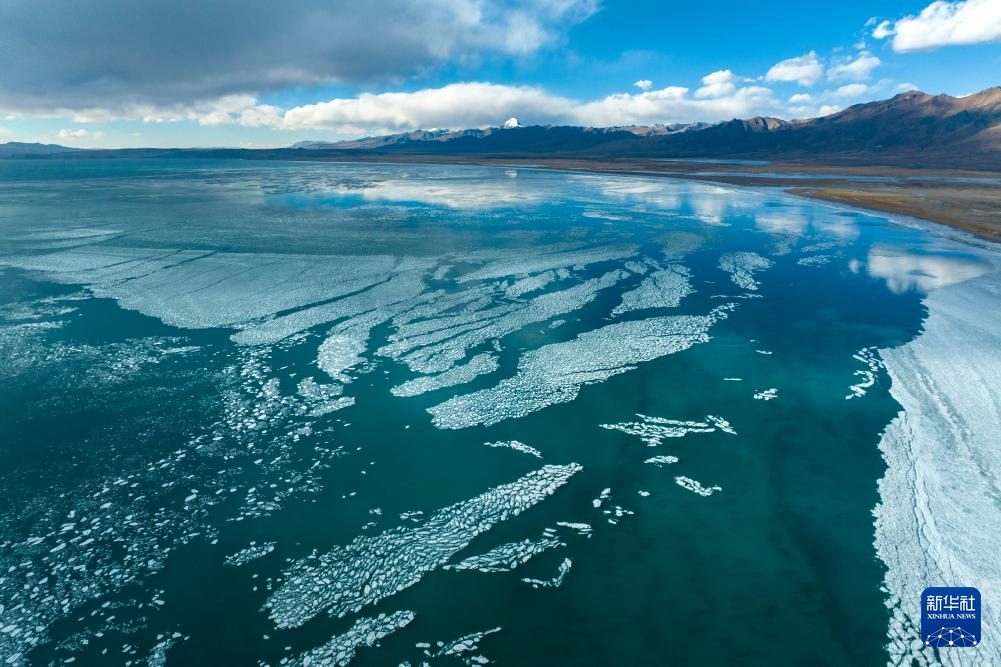 瑪旁雍錯與遠處的岡仁波齊峰(1月29日攝,無人機照片)。新華社發(fā)(旦增努布攝)
