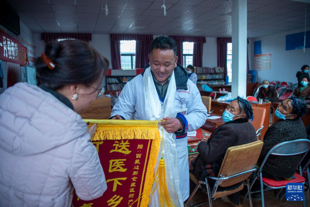 義診活動(dòng)即將結(jié)束時(shí),拉布村駐村工作隊(duì)為加央和同事們送來了錦旗。工作隊(duì)隊(duì)長(zhǎng)邊巴卓瑪講:“義診活動(dòng)很有意義。醫(yī)生們到了村里,能解決農(nóng)牧民看病難的問題,我們真的很感謝他們?!?/p>
