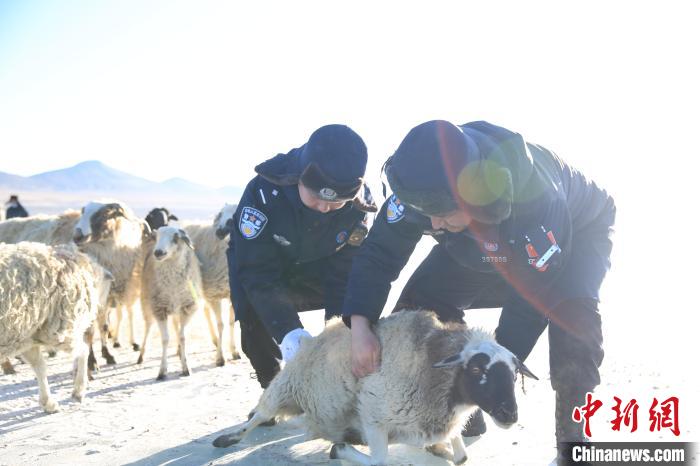 在光滑的冰面上,不時有小羊摔倒,甚至有“懶惰”的大羊直接“趴窩”不前,民警們不是將他們抱著就是扶著前行。在海拔5070米的冰面上負重前行,民警大口喘著粗氣,還時不時踩滑摔跤,但臉上始終洋溢著幸福的笑容。