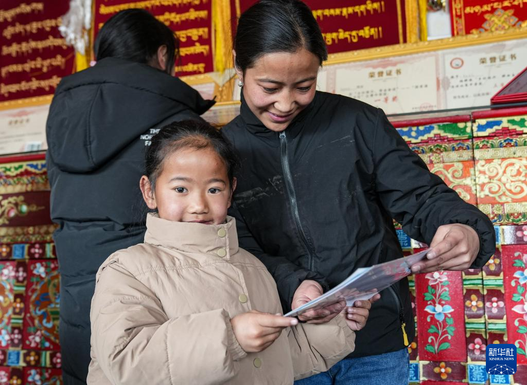 阿歐的外孫女云丹秋措向媽媽展示她自己獲得的獎狀(1月31日攝)。新華社記者 晉美多吉 攝