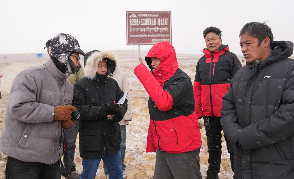 新華社記者(左二)在三江源國(guó)家公園(唐古拉山北部片區(qū))采訪。新華社記者 晉美多吉 攝