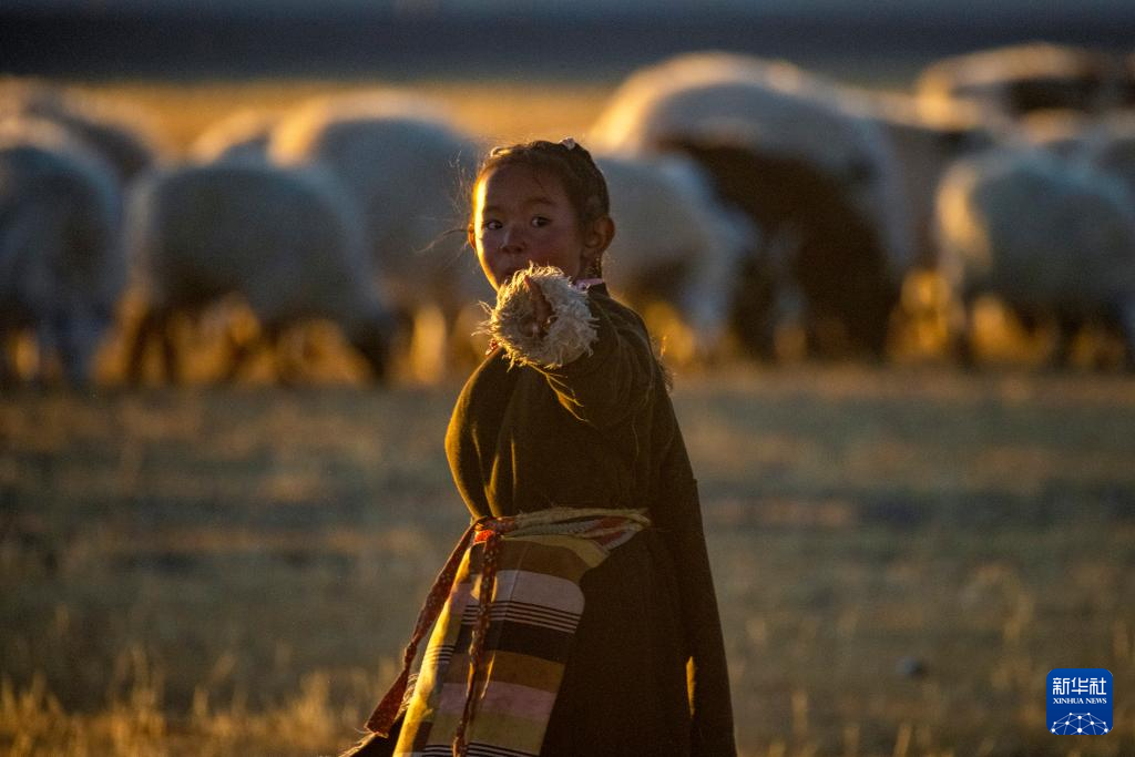 丹增4歲的小妹妹拉姆卓瑪在牧場上迎接姐姐趕羊入圈(2023年12月18日攝)。新華社 姜帆 攝