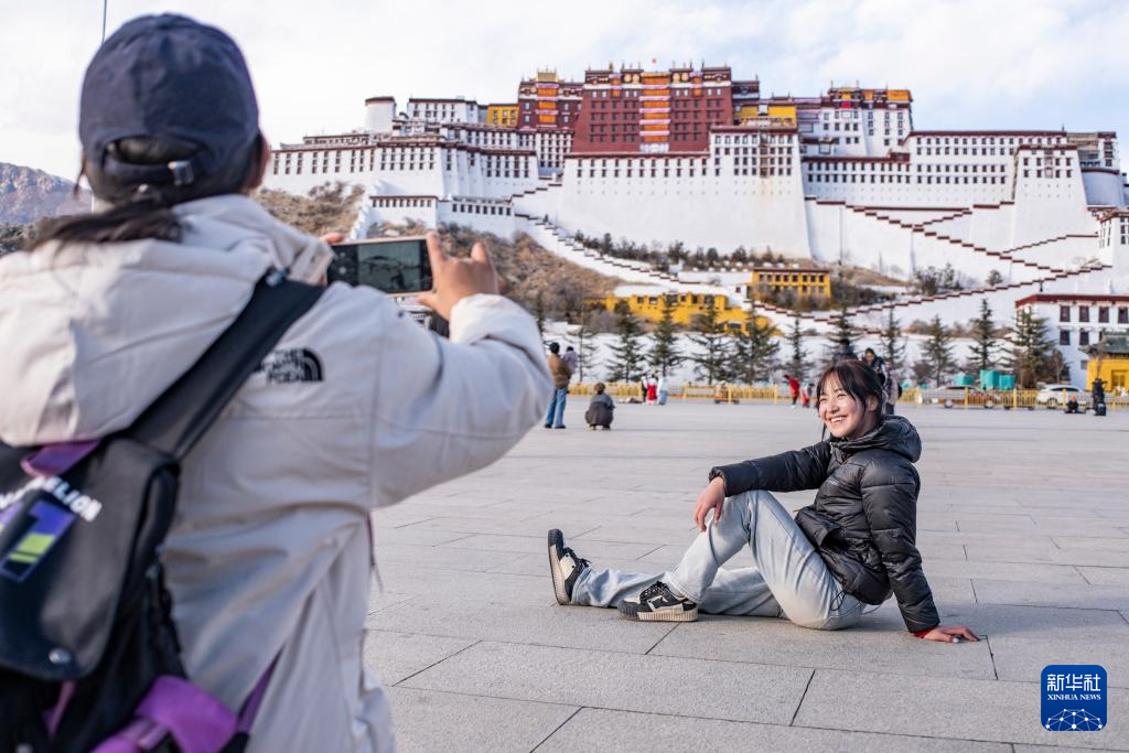 在拉薩市布達拉宮廣場上,丹增(右)正在拍照留念(2024年1月28日攝)。新華社 孫非 攝