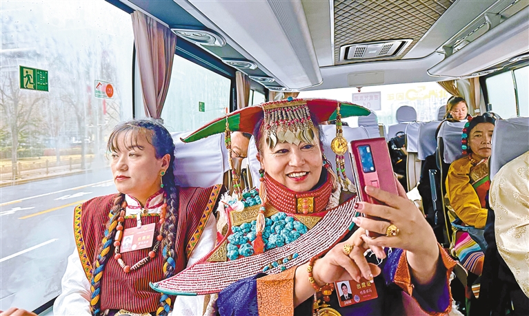 圖為全國(guó)人大代表格桑卓瑪乘車(chē)前往會(huì)場(chǎng)。記者 索朗群培 攝