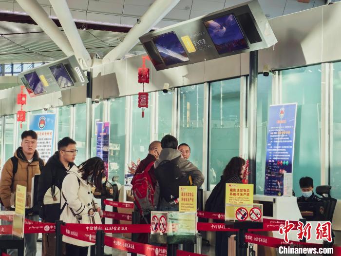 圖為拉薩貢嘎國際機場內(nèi),旅客排隊等待安檢。姚文杰 攝