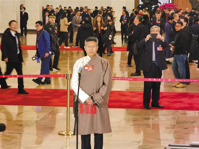 圖為3月7日上午,全國(guó)政協(xié)十四屆二次會(huì)議第二場(chǎng)“委員通道”集體采訪活動(dòng)開(kāi)啟。圖為住藏全國(guó)政協(xié)委員達(dá)瓦頓珠亮相“委員通道”并回答記者提問(wèn)。
