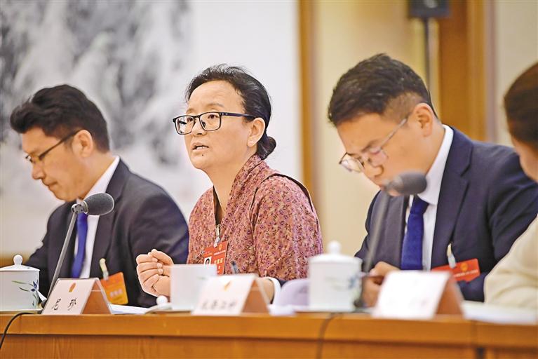 圖為3月7日,西藏代表團(tuán)舉行全體會(huì)議,傳達(dá)學(xué)習(xí)習(xí)近平總書(shū)記在看望參加全國(guó)政協(xié)十四屆二次會(huì)議的民革、科技界、環(huán)境資源界委員并參加聯(lián)組會(huì)議時(shí)的重要講話,審議國(guó)務(wù)院組織法修訂草案,繼續(xù)審查計(jì)劃報(bào)告和草案、預(yù)算報(bào)告和草案。圖為尼珍代表在會(huì)上進(jìn)行討論發(fā)言。 旦增西旦 攝