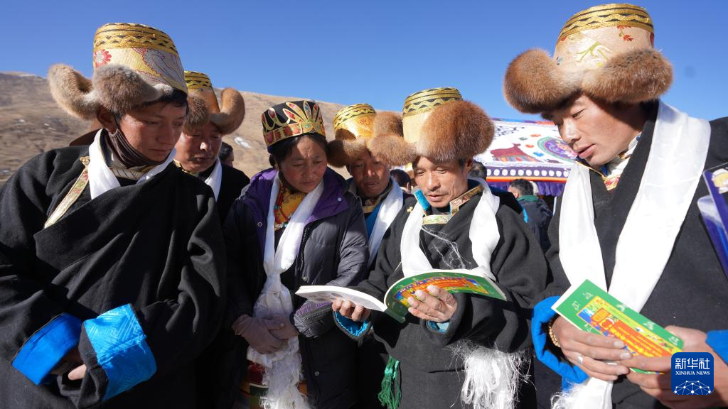 唐加鄉(xiāng)村民在達布天文觀測臺旁翻看2024年藏歷(3月9日攝)。(次昂玉珍 攝)