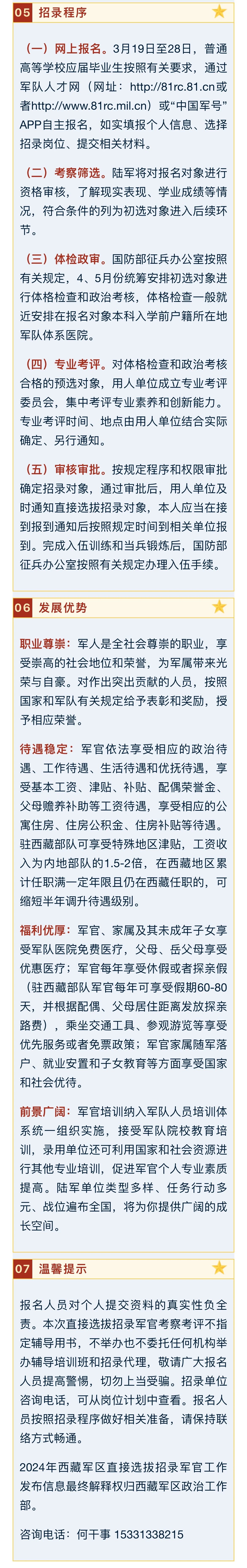 根據(jù)軍隊有關(guān)政策規(guī)定,按照全軍統(tǒng)一部署,現(xiàn)就2024年上半年西藏軍區(qū)直接選拔招錄軍官有關(guān)事項公告如下: