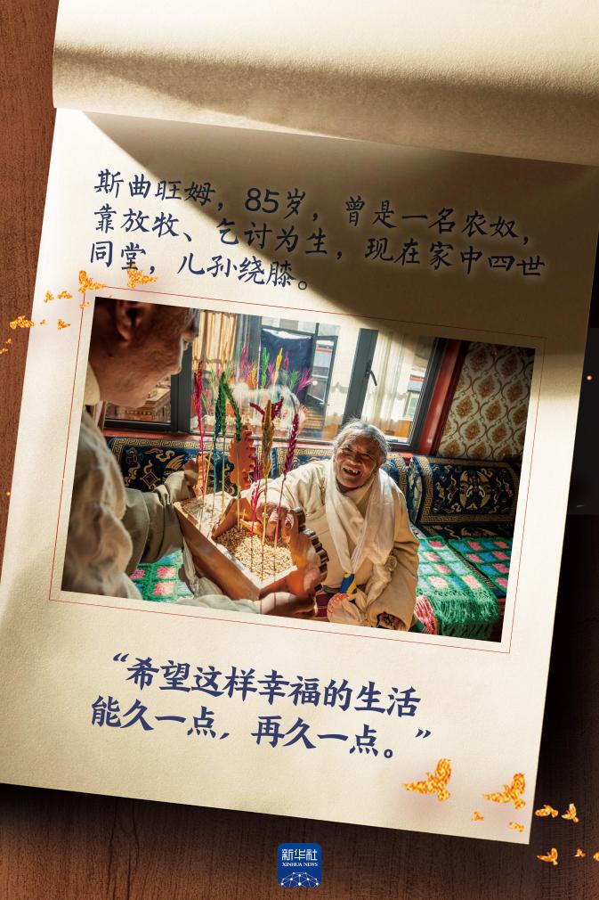 斯曲旺姆和外婆相依為命。她回憶說:“那時我們沒有自己的牛羊,替農(nóng)奴主放牧一整年,換來的糌粑也不夠吃,僅有的收入還要交種類繁多、難以負(fù)擔(dān)的稅,許多時候只能靠乞討過活。”