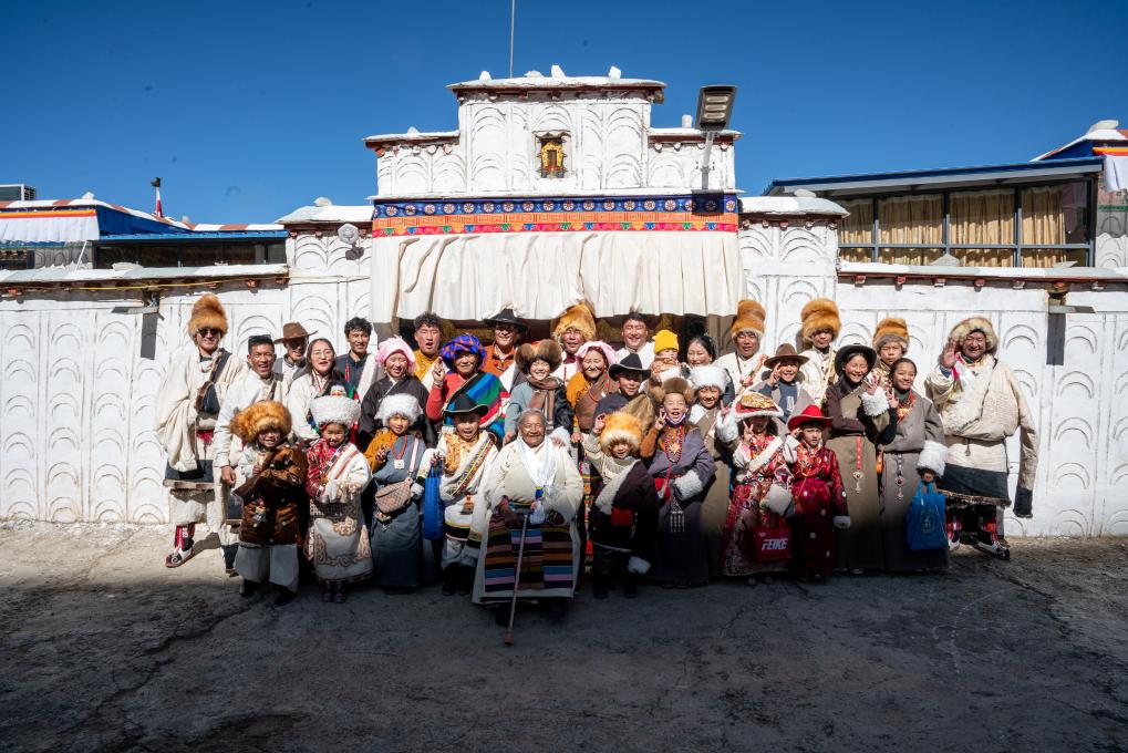 在西藏拉薩市當(dāng)雄縣公塘鄉(xiāng)甲根村,斯曲旺姆(前中)和家人們一起拍攝全家福(2月10日攝)。新華社記者 丁增尼達(dá) 攝