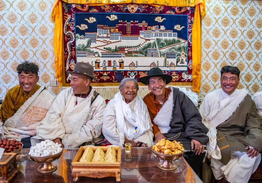 今年藏歷新年,斯曲旺姆的兒女們帶著各自的小家庭來甲根村團(tuán)聚。孩子們依次給老人獻(xiàn)上哈達(dá),敬上青稞酒,被圍坐在中間的斯曲旺姆,身邊滿是歡聲笑語。