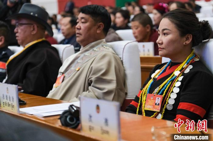 資料圖為2024年1月9日,西藏自治區(qū)兩會期間,少數(shù)民族界政協(xié)委員、墨脫縣達(dá)木珞巴民族鄉(xiāng)女鄉(xiāng)長布姆曲珍(右一)在拉薩參會。江飛波 攝