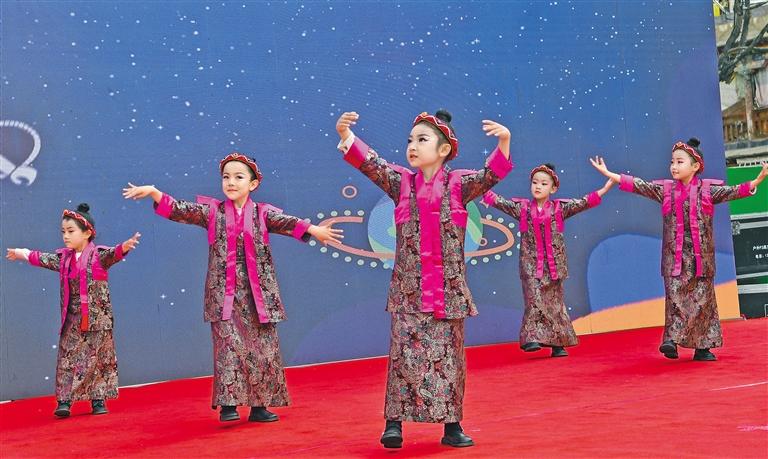 3月26日,拉薩市城關(guān)區(qū)吉崩崗街道黨工委組織街道各社區(qū)和轄區(qū)企事業(yè)單位開展“農(nóng)奴翻身做主人 哈達(dá)獻給共產(chǎn)黨”主題文藝演出。圖為城關(guān)區(qū)第八幼兒園小朋友表演舞蹈《美麗的仁增旺姆》。記者 洛桑 唐斌 攝
