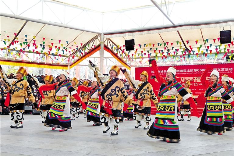 3月25日,由拉薩市城關(guān)區(qū)委、區(qū)政府主辦,城關(guān)區(qū)委宣傳部承辦的“我們的幸福生活”紀(jì)念西藏民主改革65周年文藝活動,在宗角祿康公園舉行?;顒釉陂_場歌舞《美麗的西藏·可愛的家鄉(xiāng)》中拉開序幕,現(xiàn)場觀眾熱情高漲,隨著歌舞旋律的起伏,不時報以熱烈的掌聲。此次文藝活動充分展現(xiàn)了高原各族兒女對中國共產(chǎn)黨、偉大祖國和新時代的感恩之情。城關(guān)區(qū)委宣傳部常務(wù)副部長王全勝表示:“通過搭建文藝演出平臺,各族群眾能夠一展才藝、分享幸福生活,讓大家零距離參與文化活動,既豐富了人民群眾的精神文化生活,又激發(fā)了大家共建幸福新西藏的熱情?!?/p>