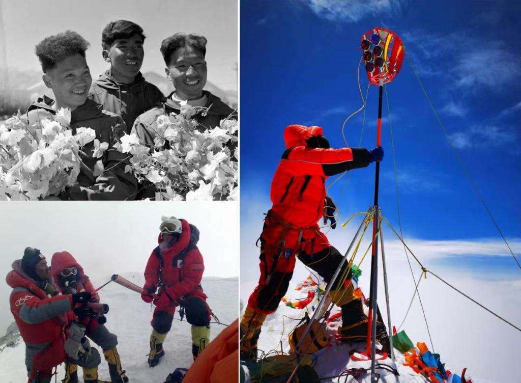拼版照片:左上圖為1960年5月登上珠穆朗瑪峰峰頂?shù)闹袊巧疥犼爢T王富洲(右)、貢布(中)和屈銀華(資料照片,新華社發(fā));左下圖為2008年5月8日,北京奧運圣火珠峰傳遞登山隊隊員羅布占堆(左)點燃第一棒火炬手吉吉手中的“祥云”火炬(新華社發(fā));右圖為2020珠峰高程測量登山隊隊員在珠穆朗瑪峰峰頂開展測量工作(2020年5月27日新華社特約記者扎西次仁攝)