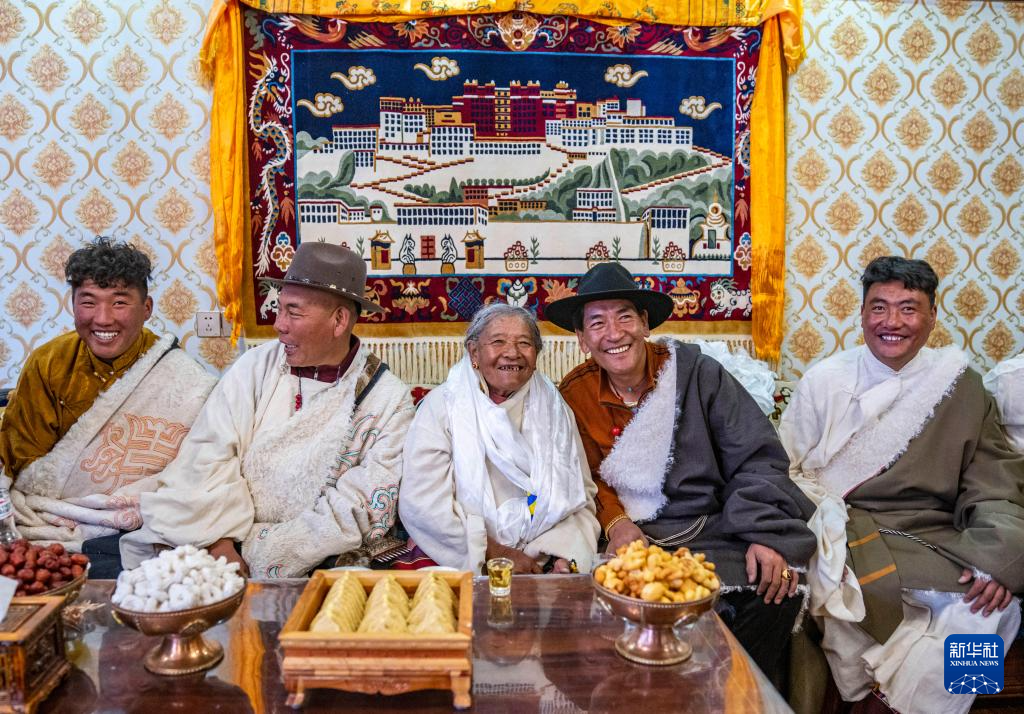 2024年藏歷新年,斯曲旺姆的兒女們帶著各自的小家庭來甲根村團(tuán)聚,孩子們依次給老人獻(xiàn)上哈達(dá)、敬上青稞酒。斯曲旺姆被滿堂兒孫圍坐中間,歡歌笑語回蕩在明亮寬敞的客廳里。