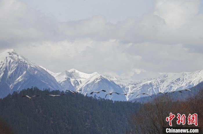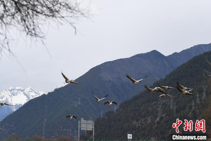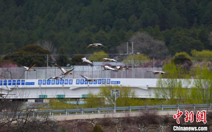 圖為拉薩至林芝公路前飛翔的黑頸鶴。益西旦增 攝