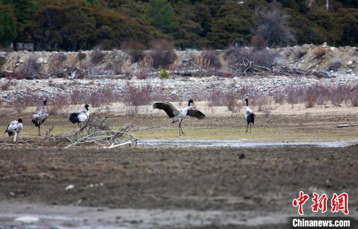 圖為黑頸鶴河邊覓食嬉戲。索朗多杰 攝